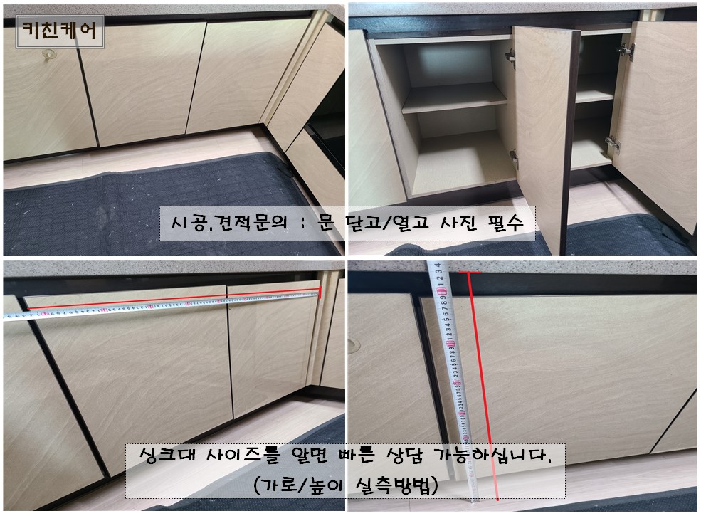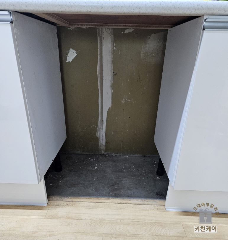 - 시공내용 : 식세기설치공간과 동일 사이즈 하부장 탈거, 마감재 절단, 벽수전 설치를 위한 상판 타공